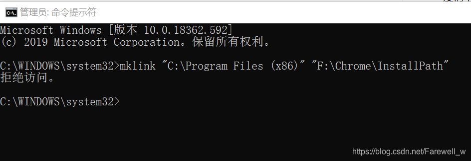 所以最终命令应该是这样的mklink “C:\Program Files(x86)\Google” "F:\Chrome\InstallPath\Google"