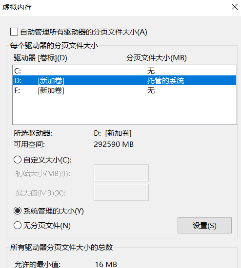 注:也可以自定义虚拟内存的大小。如果勾选自动管理所有驱动器的分页文件大小(A),默认托管在系统盘。小编由于避免占用C盘内存,所以设置了D盘。
