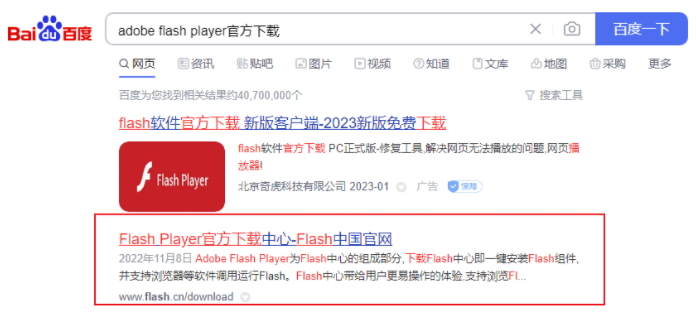1、我们在百度搜索框中输入Adobe Flash Player官方下载,我们点击可以下载的链接进去(如图所示)。